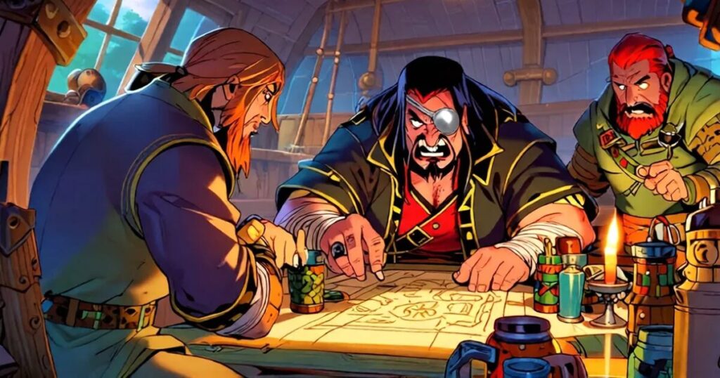 船内の広間では、ゲロム船長が古ぼけた大机を囲むように座り、数人の側近たちと低く唸るような声で謀議を巡らせていた。
