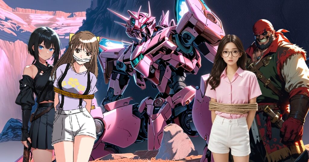 幻蛇のラヴィニア、横たわって動かないCOSMOS-008 フェアリーライト、海賊の男、背景は、Leonardo.Ai App – Generate AI Images, Videos & DesignsのモデルLeonardo Anime XL(Anime General)で生成しました。