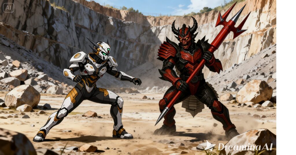 切り立った岩壁に囲まれた広大な採石場の中央で、二つの影が向かい合っている。