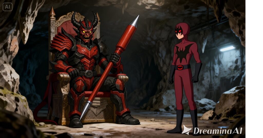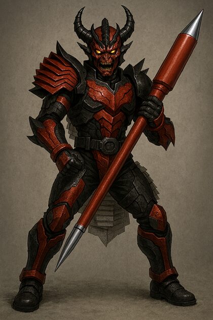 赤黒い甲冑に身を包み、巨大な赤いペンのような武器を手に、玉座にふんぞり返る怪人。