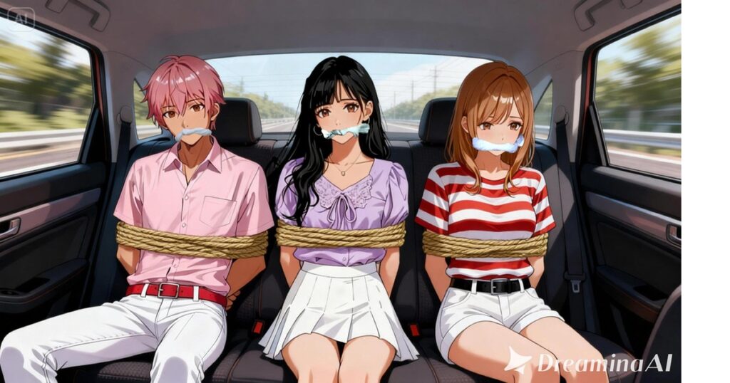 その後部座席には、三人の若者が無理やり押し込まれている。基樹、早弥香、そして玲奈。三人とも両手を背中で縄に縛られ、口にはきつく猿轡を噛まされていた。
