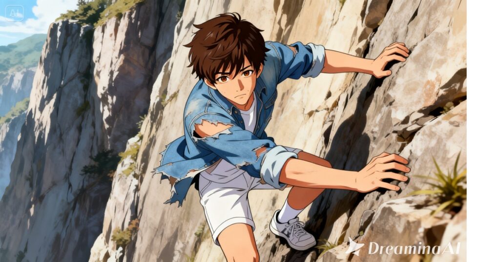 遼馬は必死に岩肌へ足をかけ、少しずつ崖をよじ登り始めた。