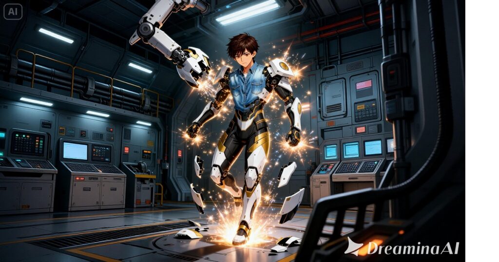 皆上遼馬のヴァルダー装着過程は、Dreamina: Create realistic talking avatars with AI avatar generatorで生成しました。