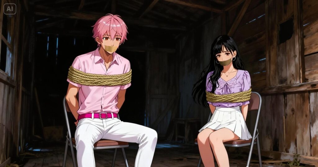 縛られている西沢基樹と綾瀬早弥香(口のガムテープ除く)は、Dreamina: Create realistic talking avatars with AI avatar generatorで生成しました。