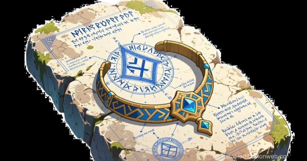 「失われた幻想文明の儀式用ブレスレットの設計図と見られます。中心部のルーン文字は色褪せてはいますが、まだ判読可能でして……魔法的特性と文化的意義を示唆しているのです」