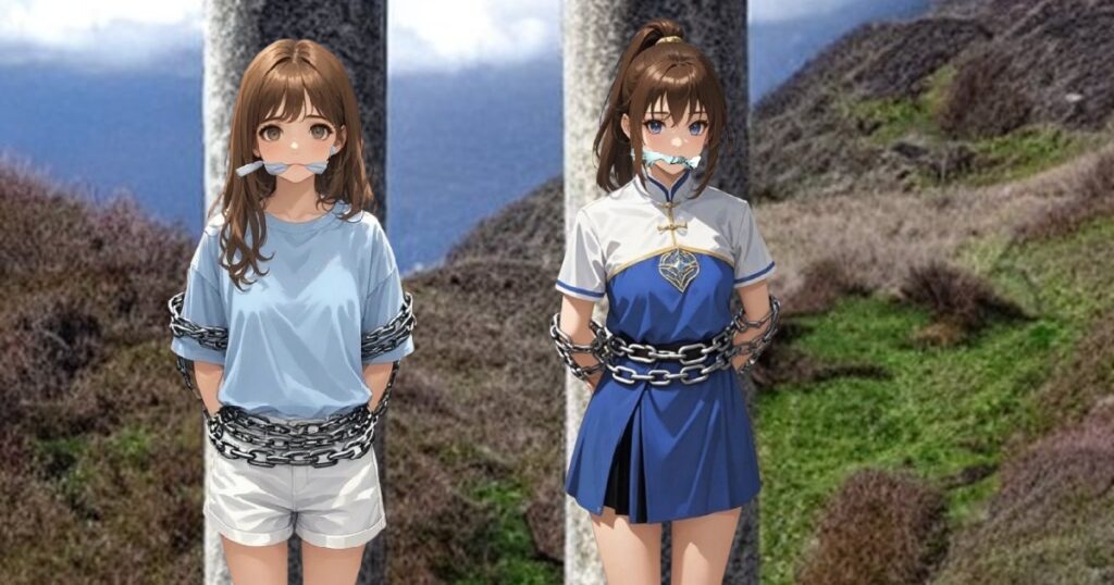 丘の上に並ぶ二本の石柱に、桐尾史奈と笹南侑衣梨の姿があった。口には猿轡を噛まされ鎖で縛られ、逃げる術もなく苦悶の表情を浮かべている。