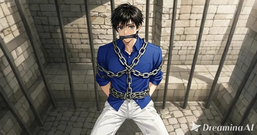 拘束されている草川律希は、Dreamina: Create realistic talking avatars with AI avatar generatorで生成した後、無料AI画像ジェネレーター:テキストでAIアートを創造 – SeaArt AIのクイックツール画像編集プロシーアート AIで加工して作成しました(口枷除く)。