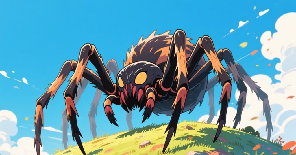 影を覆う巨大な蜘蛛の魔物――ジャイアントスパイダー。無数の脚が芝生の地面を叩く音が、遠雷のように響き渡る。その牙が光を反射し、今にも犠牲者を貪ろうと唸っていた。