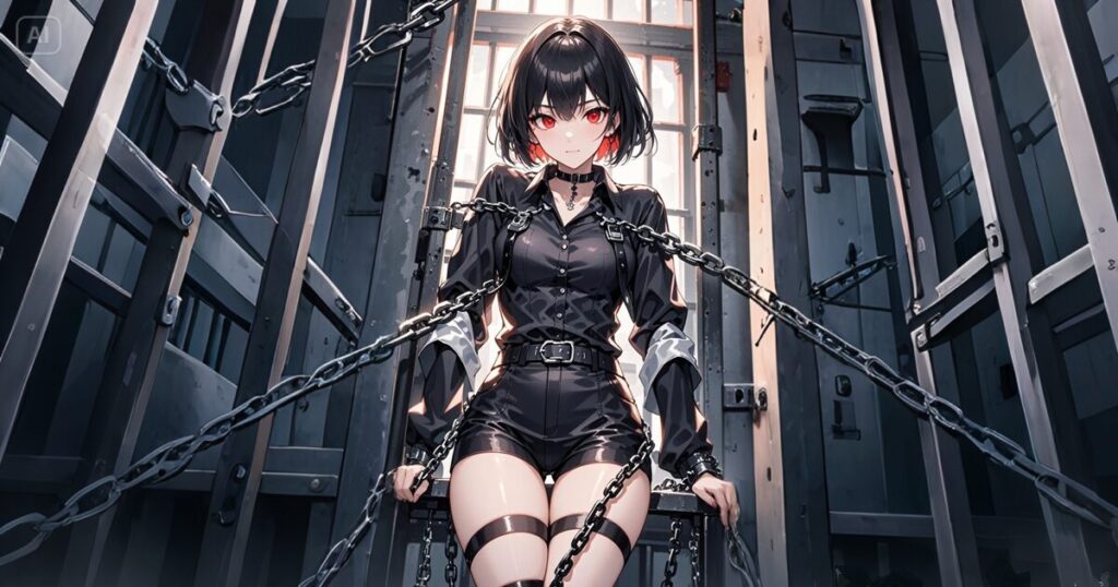 冷たく青白い蛍光灯の下で、鎖と鉄枷に何重にも拘束された女が、無表情に座っていた。