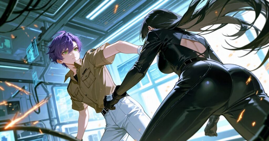 金属の床を蹴る音、風を裂く気配。詩郎も素早く応じ、拳と脚がぶつかり合う。