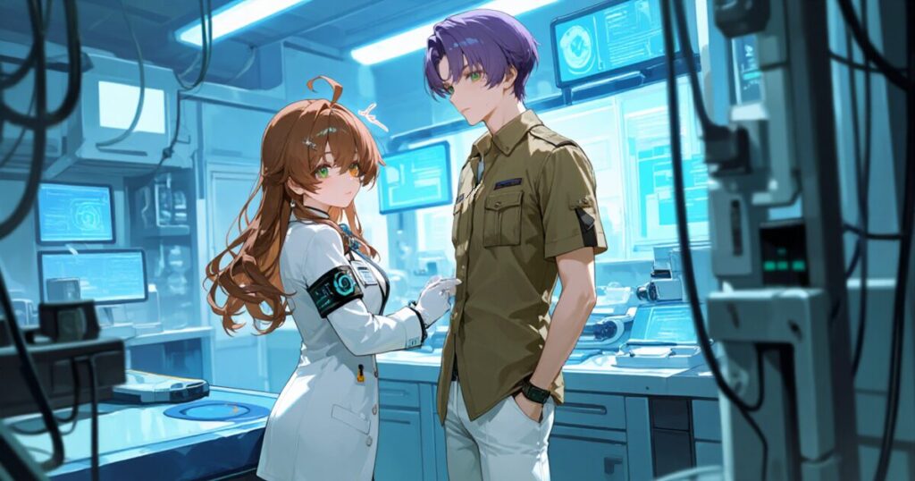 上半身は裸。無数のセンサーが胸や腹、腕に貼られ、薄青いホログラムが身体の断面をスキャンしている。