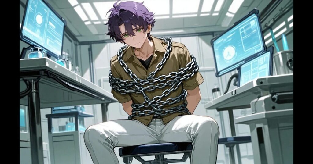 アスカロン財団本部「オメガ・タワーズ」。最深部に位置する技術開発研究部副本部長アーノルド=フックス専用ラボは、外界から隔絶された冷たい空気が支配していた。壁に埋め込まれた電磁装置が低く唸り、蛍光灯の白い光が、椅子に拘束された寺瀬詩郎のやつれた横顔を照らしている。