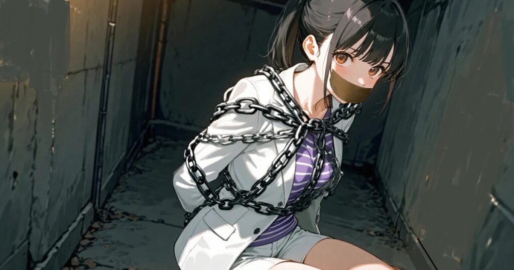 黒百合と、その側に立つ手下の女・百合鴉。そして奥の狭い区画には、鎖で全身を固定され、口にはガムテープを貼られた錦織佳代が押し込められていた。