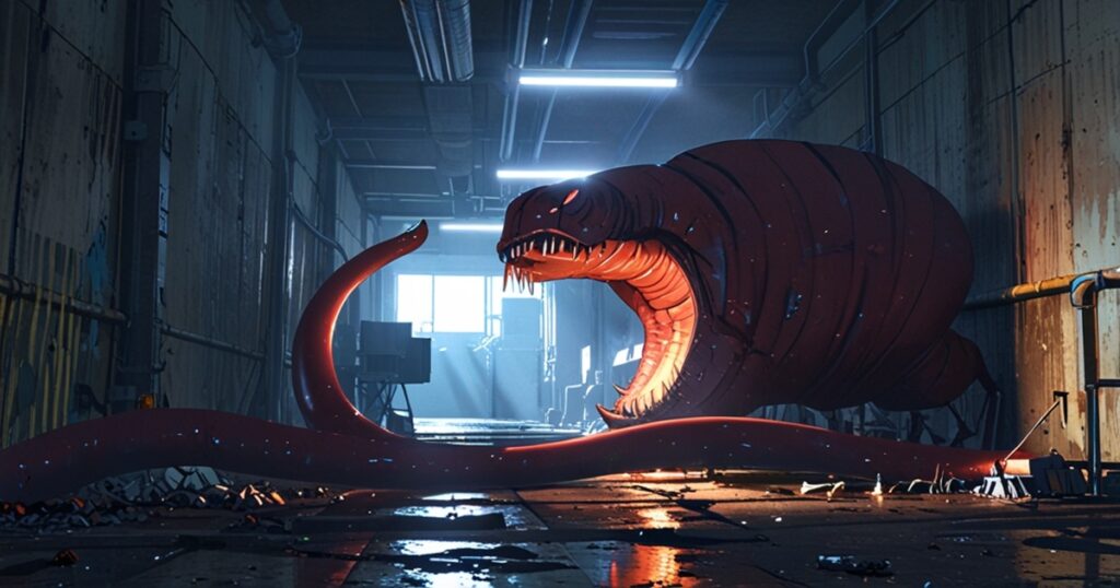 蛇のようにうねる巨大ミミズ。その口は円形の牙が渦を巻き、全てを削り取る歯車のようだ。