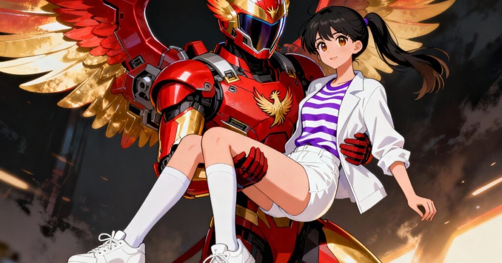 天凰輝シグフェル――その正体である牧村光平は、佳代を優しく下ろしながら言う。