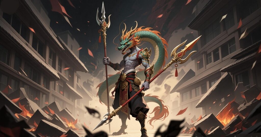 彼の背後で瓦礫が崩れ落ち、まるで龍が再び羽ばたく合図のようだった。