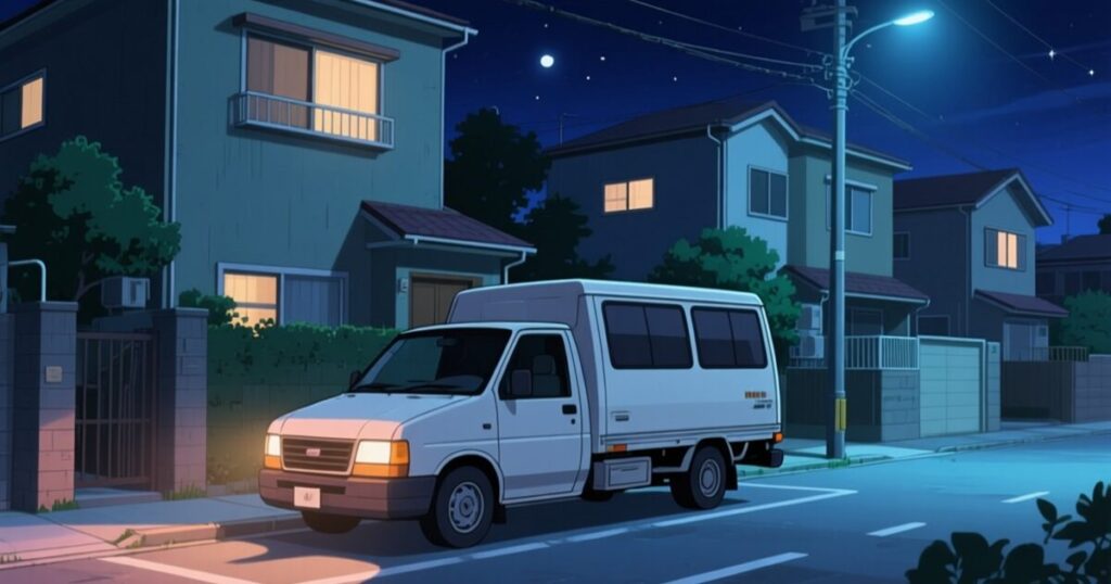 深夜の友貞家の邸宅前には、人気のない道路に溶け込むように、一台の軽貨物車が路駐していた。
