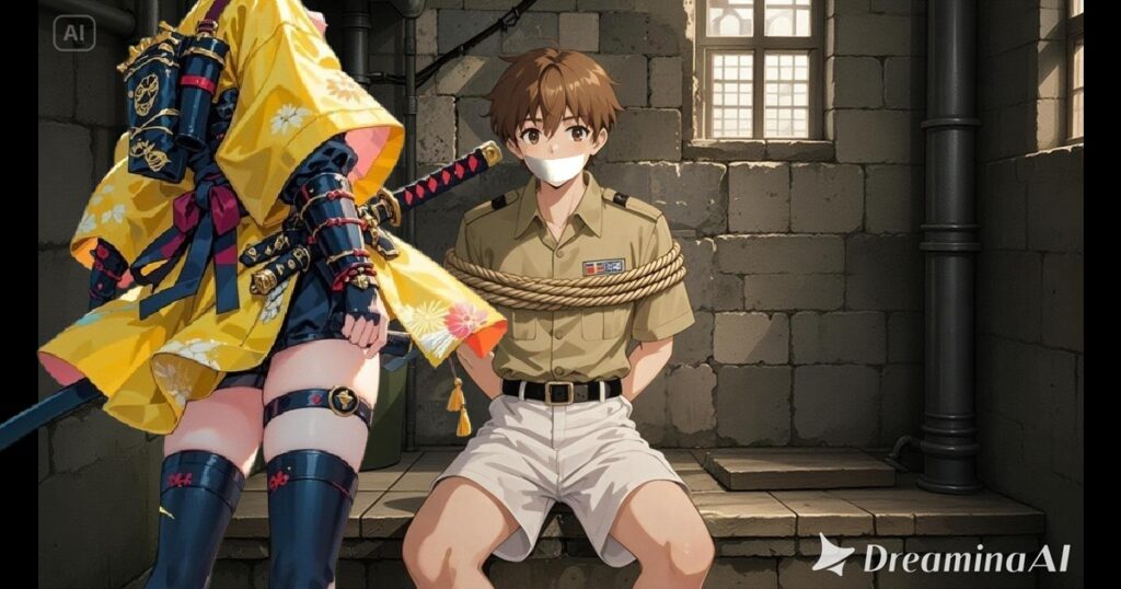 忍び装束を着た相模路香の後ろ姿、縛られている友貞稜太(にへんそうしている稲垣健斗)、監禁部屋背景は、Dreamina: Create realistic talking avatars with AI avatar generatorで生成しました(健斗の口のガムテープは除く)。