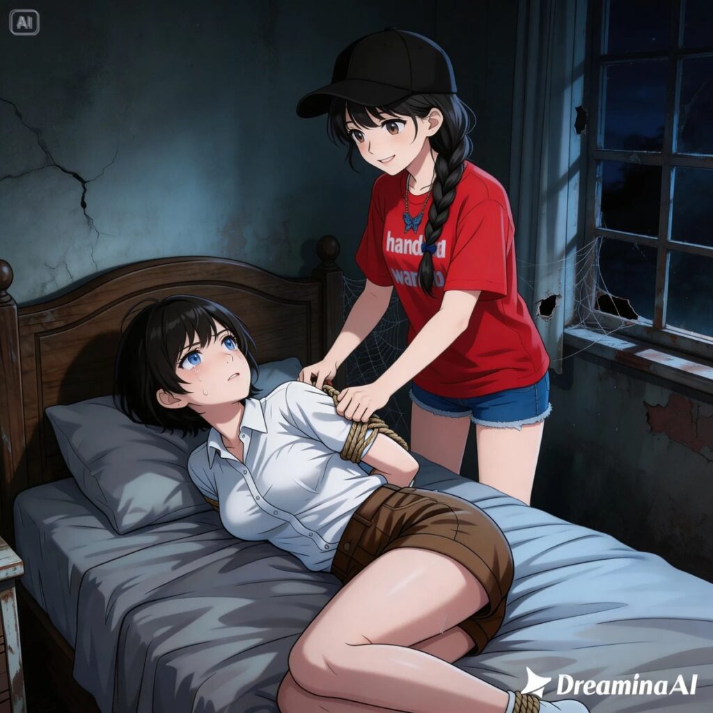 ベッドの上に無理やり寝かされ、両手両足を縄で縛られ、口には無粋なガムテープ。身動きも取れないまま、ただ必死に耐えている。