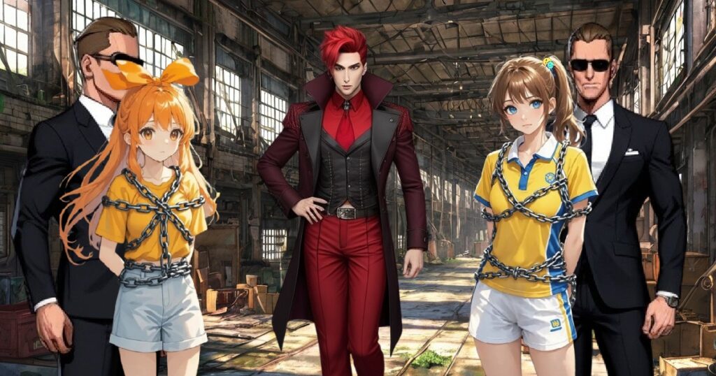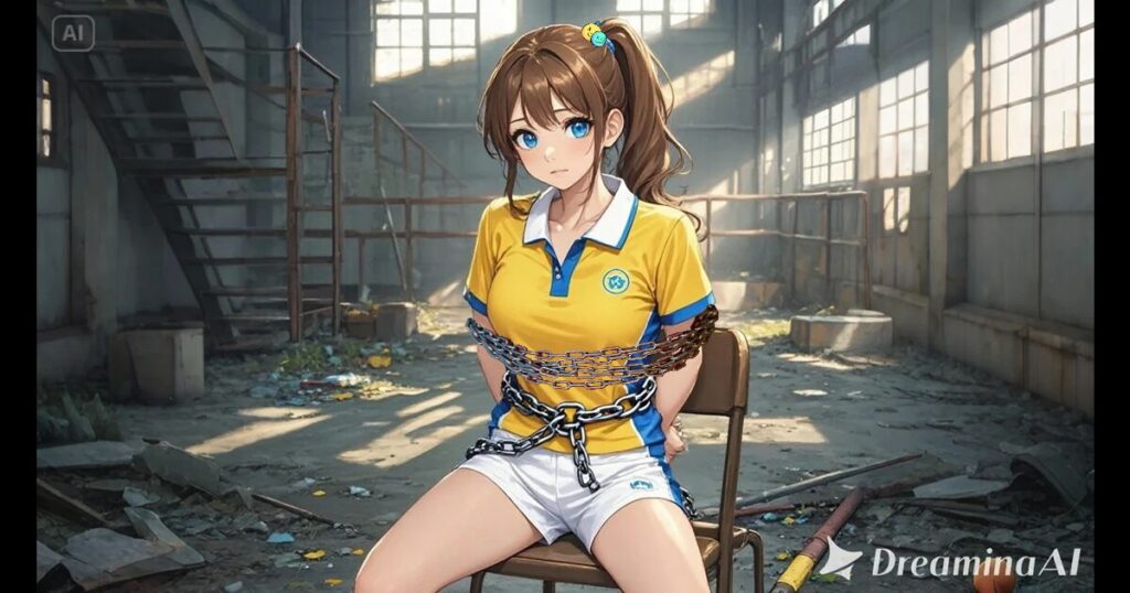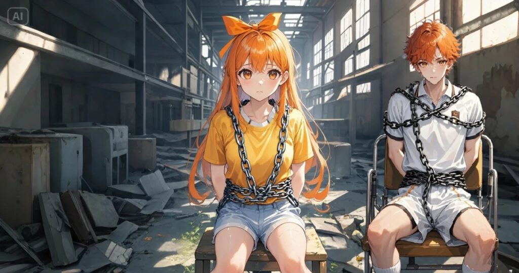 鎖で拘束された美藤美虎と漆崎亜沙美は、Dreamina: Create realistic talking avatars with AI avatar generatorで生成した画像を、無料AI画像ジェネレーター:テキストでAIアートを創造 – SeaArt AIのクイックツール テキストプロンプトによるAI画像編集で加工して作成しました(亜沙美のヘアゴムアクセサリは除く)。