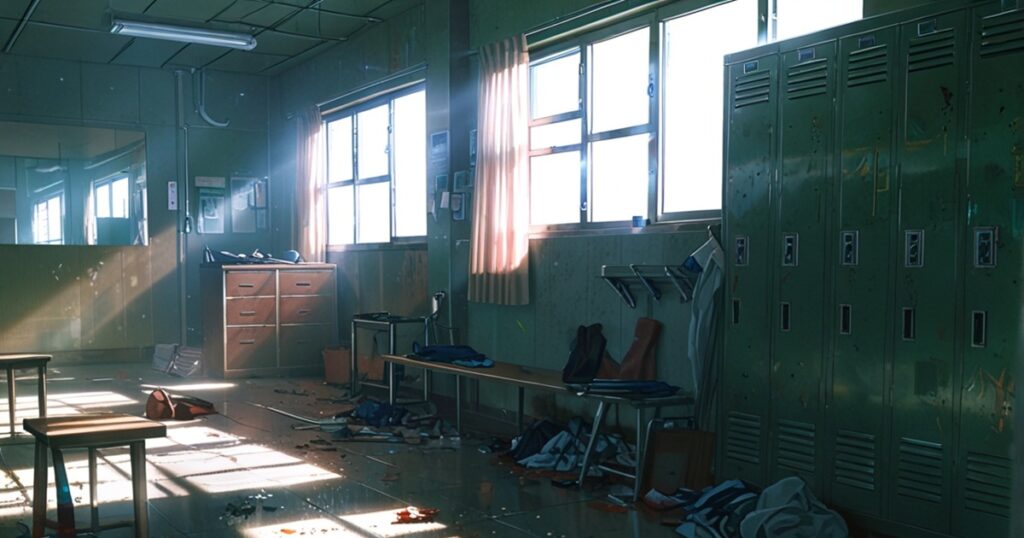 床には倒れたロッカー、散らばった衣服、そして開け放たれた窓。