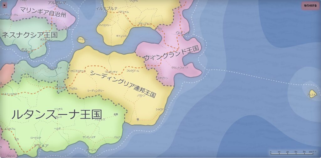 シーディングリア連邦王国周辺の大陸地図は、アズガーのファンタジーマップジェネレーター v1.108.13で生成しました。