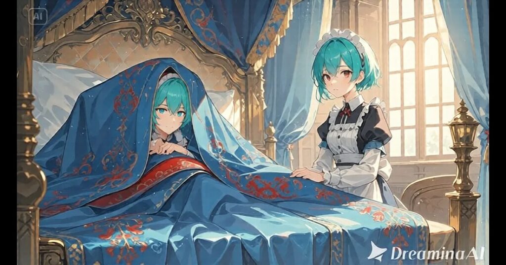 天蓋付きの大きなベッド。その上には、全身を覆い隠すように布団をかぶった人影が横たわっている。脇には、一人の侍女が控え、慎ましやかに頭を下げていた。