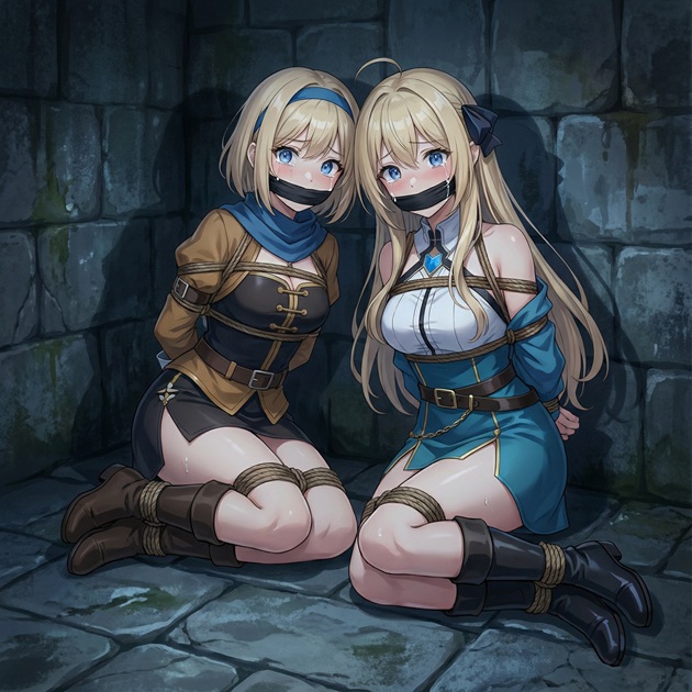 二人は並んで座らされ、縄で縛られ、口には猿轡を噛まされている。
