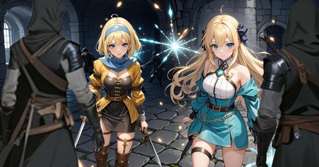 シーフ風の姉は床を蹴り、疾風のごとく黒装束の男たちへと飛び込んだ。短剣が閃き、足払いと体当たりが連続する。ソーサリス風の妹も、魔法で敵を攻撃する。