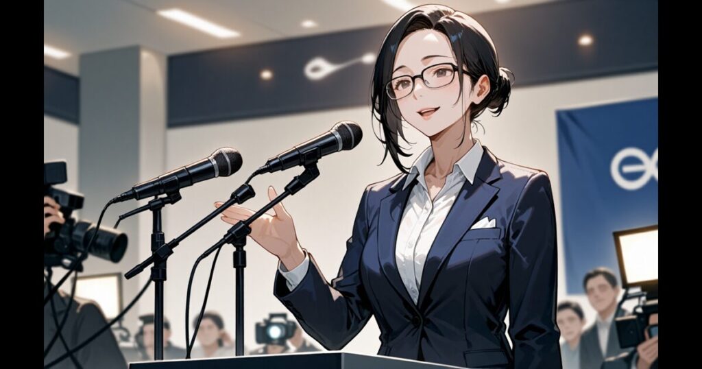 背後の党旗がわずかに揺れるたびに、彼女のシルエットが光を反射し、記者たちの視線を惹きつけた。