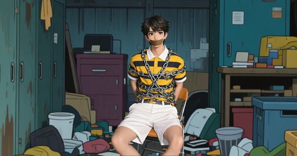 椅子に座らされた隼は、両腕を鎖で縛られ、口をガムテープで塞がれていた。
