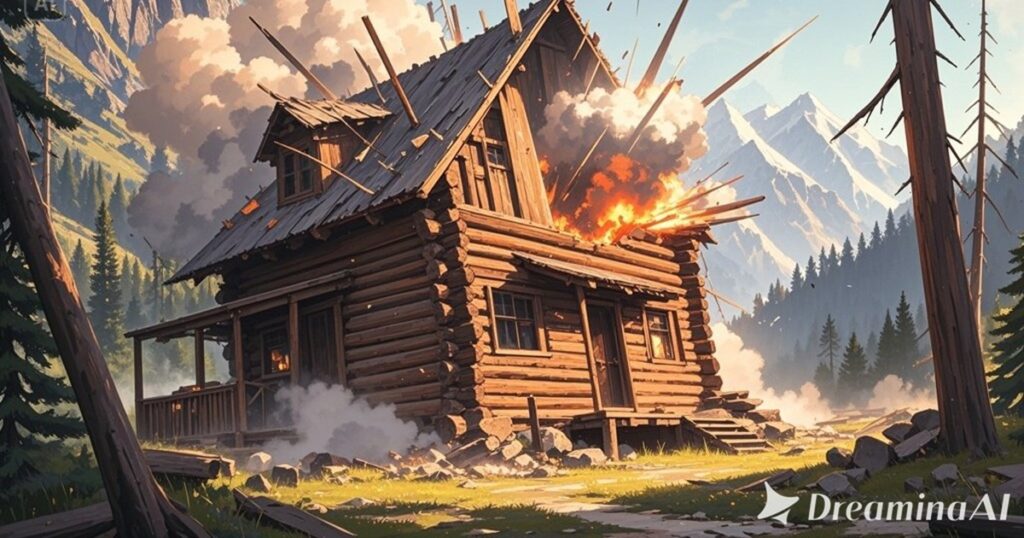 爆炎が山を揺るがし、木の破片と炎が空に舞い上がった。