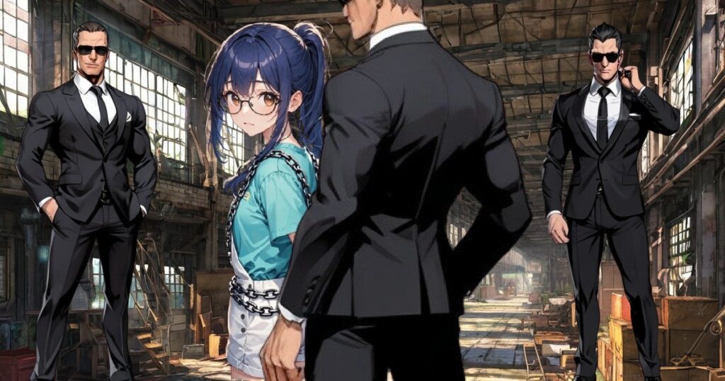 見張りの黒服が怒鳴り、銃のグリップで机を叩いた。金属音が鋭く部屋に響く。