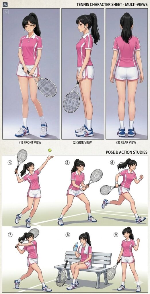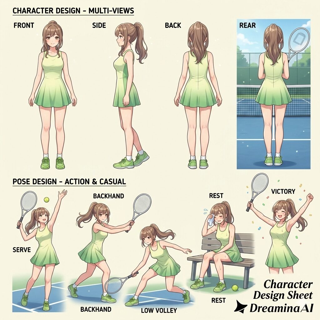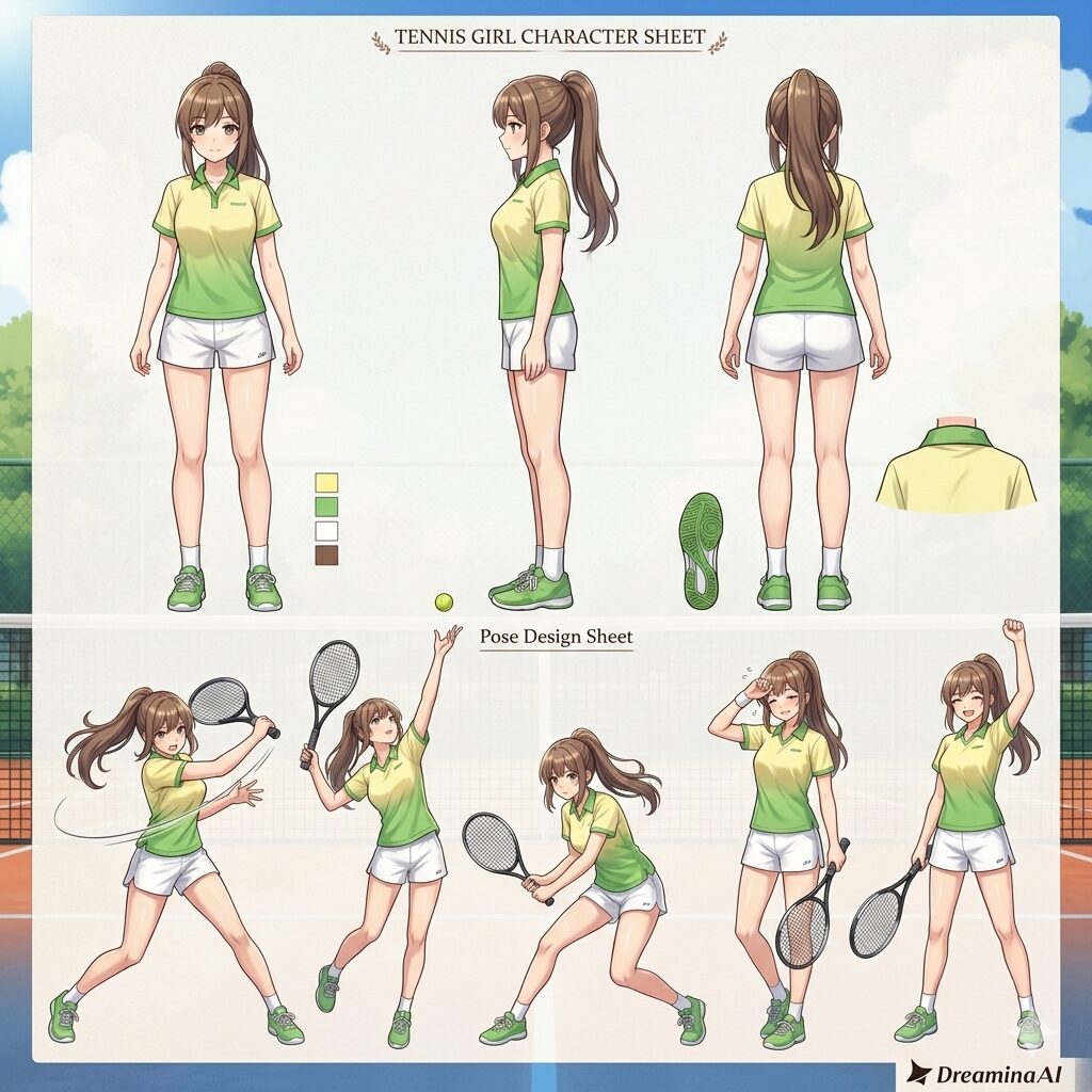 綾瀬早弥香テニスルックキャラクターデザインシートは、Google Geminiで生成しました。