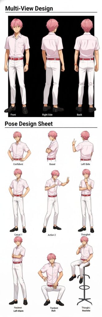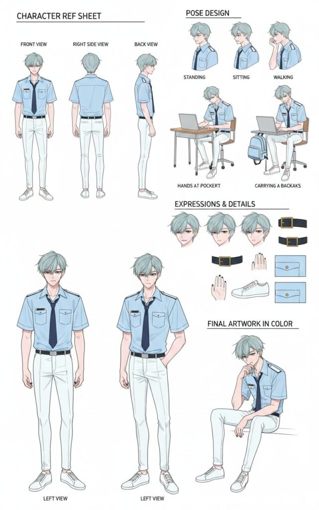 皆上遼馬私服キャラクターデザインシートは、Google Geminiで生成しました。