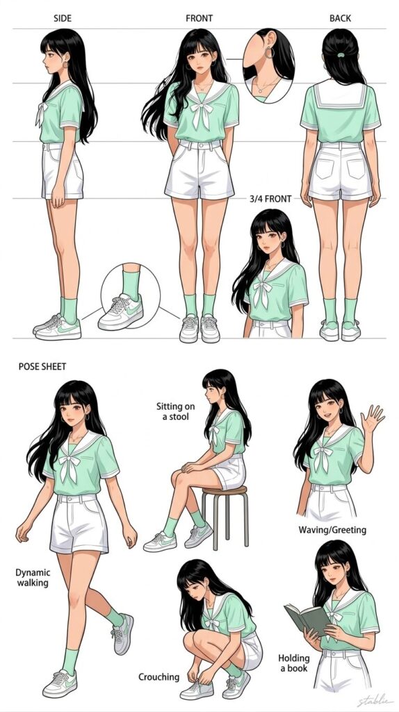 Generate character design sheet, multi views design image (front-view, side-view, back-view, rear-view), Pose design sheet, various common poses, Generate an image with the painting finish of the original image.