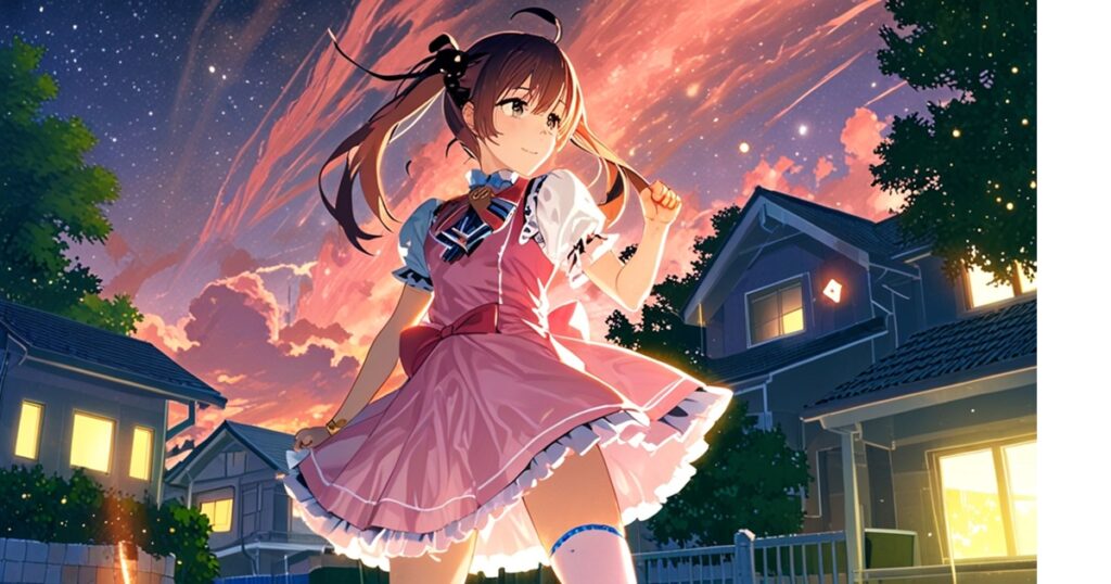 長いツインテールが夜風に揺れ、淡いピンクの衣装が星空に溶け込む。