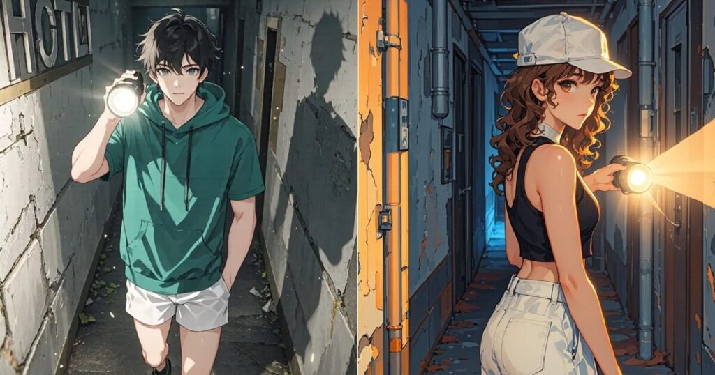 洸介は慌てて引き返し、さっきまで一緒に歩いていた通路を照らす。懐中電灯の光が揺れ、壁の染みや剥がれた壁紙が不気味に浮かび上がる。