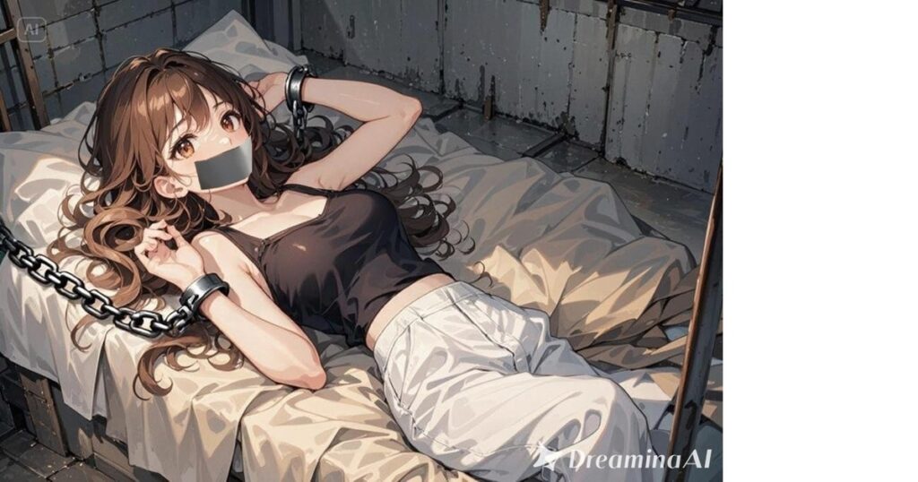 ベッドに拘束された別城寿莉愛(口のガムテープ除く)は、Dreamina: Create realistic talking avatars with AI avatar generatorで生成しました。