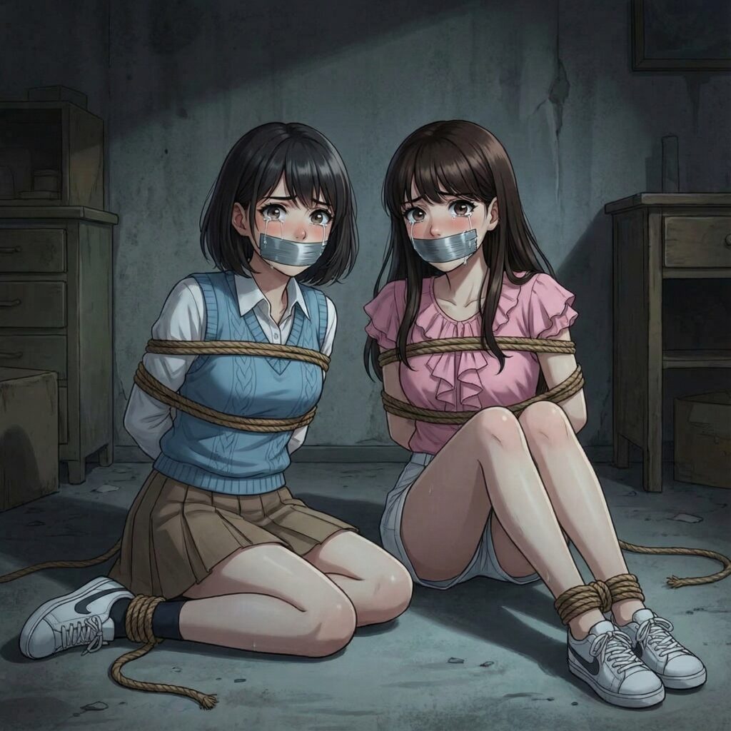 床に並ぶように座らされ、手足を縛られ、口にガムテープを貼られた二人の女子大生。
