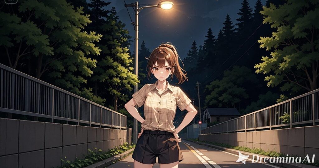 街灯の白い光の下、二人の影が向かい合う。夜の住宅街は静まり返り、遠くで車の走る音だけがかすかに聞こえていた。