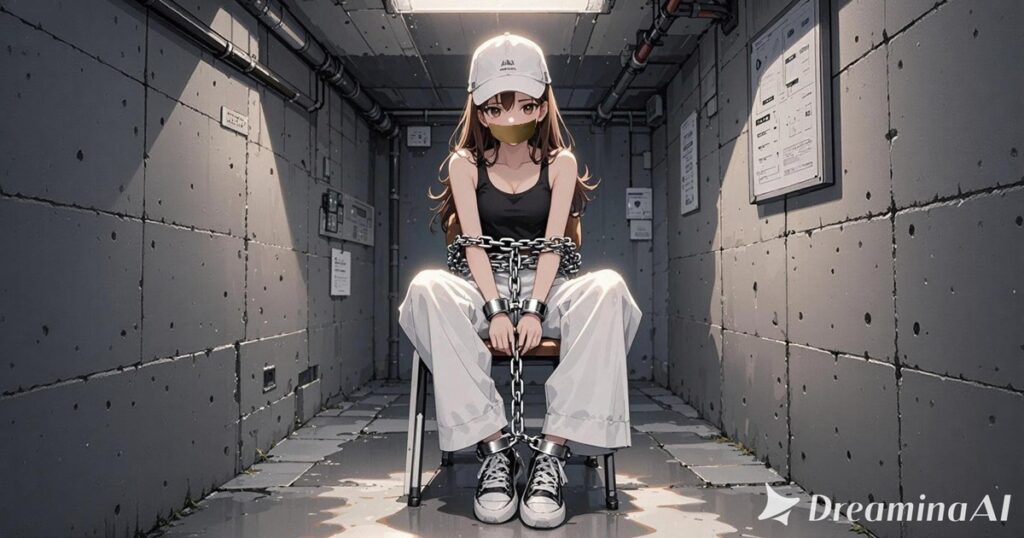 拘束された別城寿莉愛(口のガムテープ除く)は、Dreamina: Create realistic talking avatars with AI avatar generatorで生成しました。