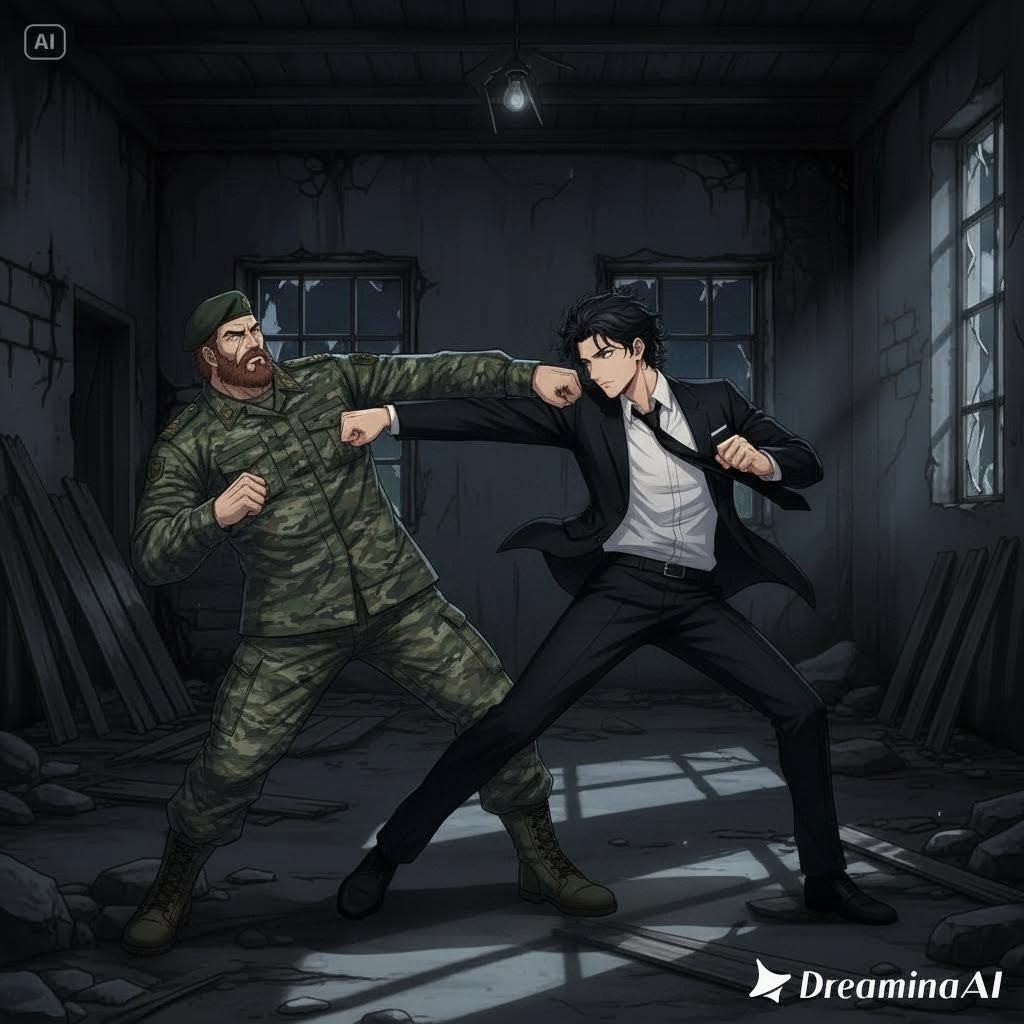 コンラッド=ヴォルフ大佐と加藤段十郎の戦闘シーンの画像生成AIイラスト@cryravens.bsky.socialによる投稿 — Blueskyは、旅鴉様提供。