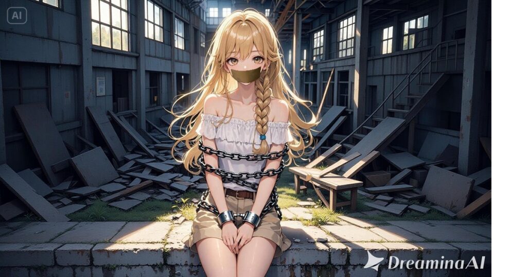 鎖で縛られ、両手は手錠で拘束されている。