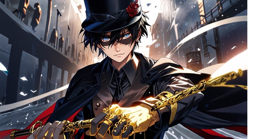 月光を背に受け、黒いシルクハットの鍔を指先で押さえながら着地する男――正義の怪盗紳士エターナルライバル。マスカレードマスクの奥の視線は鋭く、黒いタキシードとマントがビルの谷間から吹く風にはためく。