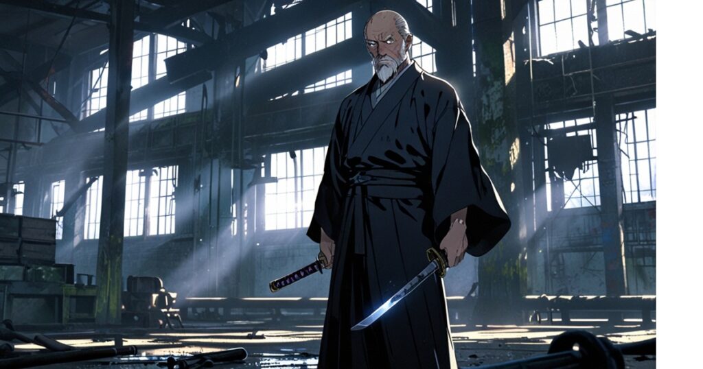 着流し姿に近い黒装束、筋骨隆々の体躯。顔には深い皺と無数の傷。腰には鈍く光る大太刀を提げている。