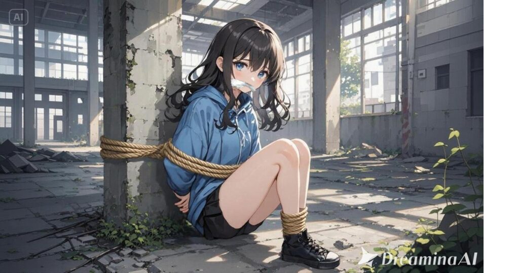 青いパーカーを着た少女が、ロープで拘束され、口には猿轡。怯え切った目でこちらを見上げている。