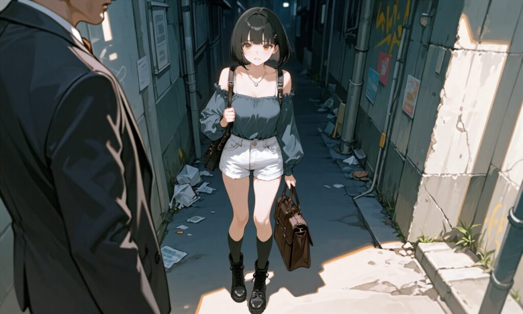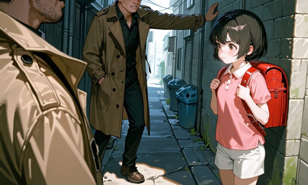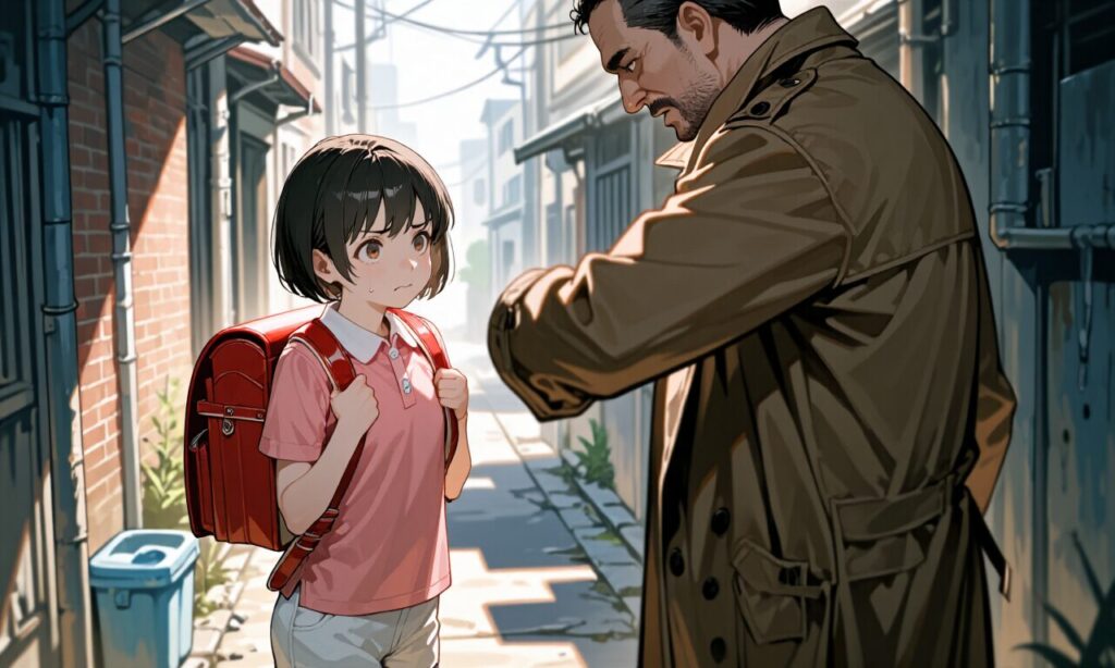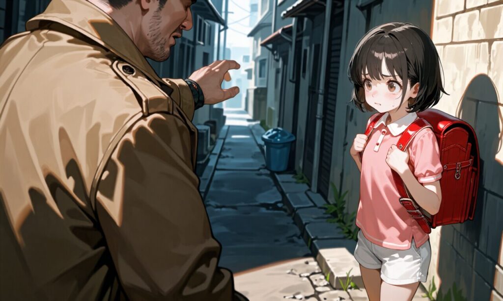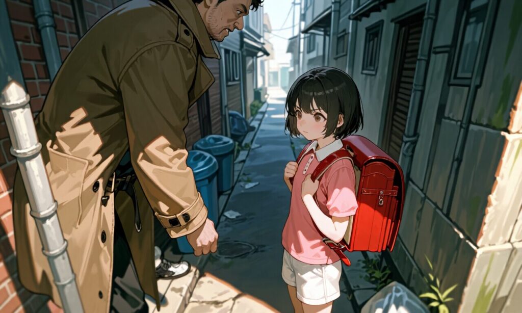 今後出番が増えそうな譜久里知世ちゃんが「下校途中で見知らぬ怪しい中年男に声を掛けられて、誘拐される直前」風な画像を作ってみました。小学校高学年のキャラなのでもう少し背を高くして年長っぽくしたかったので、あえてプロンプトには「女子中学生」と入力しておいたのですが、「ランドセル」のせいで幼く設定されてロリが入った感じになっちゃいましたね…💦